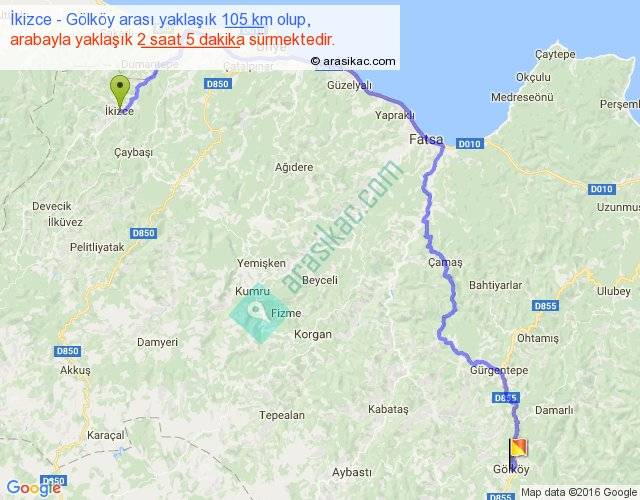 İkizce - Gölköy arası yaklaşık olarak 90 km/h ile yukarıda belirtilen sürede olup, iki yerin kuş uçuşu uzaklığı (mesafesi) 61'dir. Yolculuk otobüsle 2 saat 42 dakika sürmektedir.