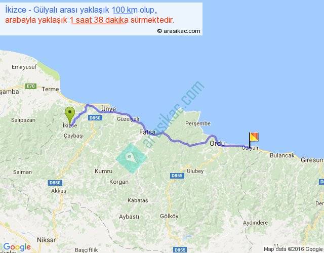 İkizce - Gülyalı arası yaklaşık olarak 90 km/h ile yukarıda belirtilen sürede olup, iki yerin kuş uçuşu uzaklığı (mesafesi) 82'dir. Yolculuk otobüsle 2 saat 7 dakika sürmektedir.
