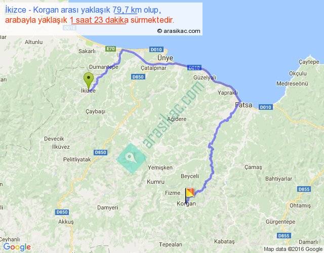 İkizce - Korgan arası yaklaşık olarak 90 km/h ile yukarıda belirtilen sürede olup, iki yerin kuş uçuşu uzaklığı (mesafesi) 34'dir. Yolculuk otobüsle 1 saat 47 dakika sürmektedir.