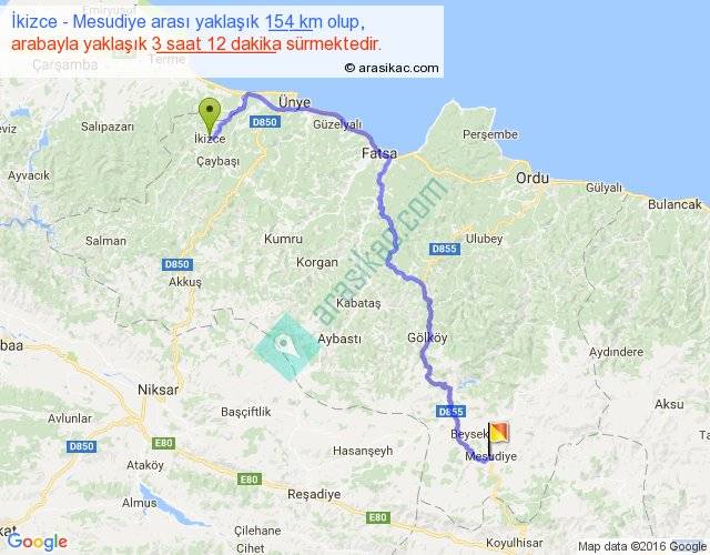 İkizce - Mesudiye arası yaklaşık olarak 90 km/h ile yukarıda belirtilen sürede olup, iki yerin kuş uçuşu uzaklığı (mesafesi) 88'dir. Yolculuk otobüsle 4 saat 9 dakika sürmektedir.