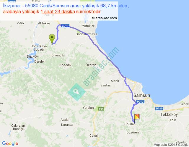 İkizpınar - 55080 Canik Samsun arası yaklaşık olarak 90 km/h ile yukarıda belirtilen sürede olup, iki yerin kuş uçuşu uzaklığı (mesafesi) 44'dir. Yolculuk otobüsle 1 saat 47 dakika sürmektedir.