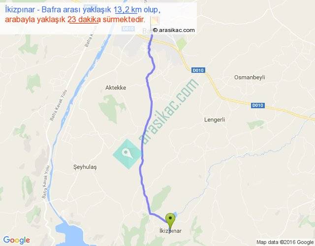 İkizpınar - Bafra arası yaklaşık olarak 90 km/h ile yukarıda belirtilen sürede olup, iki yerin kuş uçuşu uzaklığı (mesafesi) 12'dir. Yolculuk otobüsle 29 dakika sürmektedir.