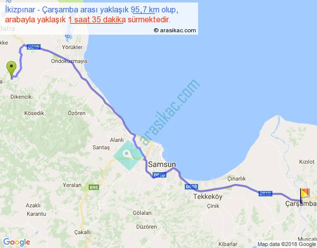 İkizpınar - Çarşamba arası yaklaşık olarak 90 km/h ile yukarıda belirtilen sürede olup, iki yerin kuş uçuşu uzaklığı (mesafesi) 73'dir. Yolculuk otobüsle 2 saat 3 dakika sürmektedir.