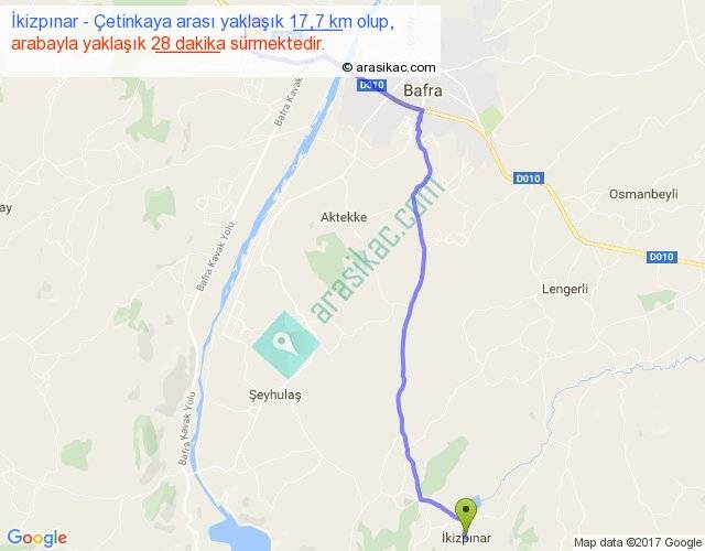İkizpınar - Çetinkaya arası yaklaşık olarak 90 km/h ile yukarıda belirtilen sürede olup, iki yerin kuş uçuşu uzaklığı (mesafesi) 14'dir. Yolculuk otobüsle 36 dakika sürmektedir.