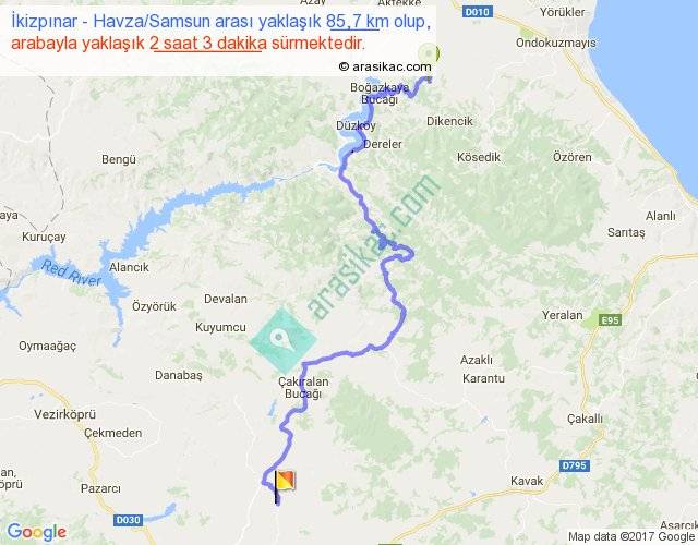 İkizpınar - Havza Samsun arası yaklaşık olarak 90 km/h ile yukarıda belirtilen sürede olup, iki yerin kuş uçuşu uzaklığı (mesafesi) 47'dir. Yolculuk otobüsle 2 saat 39 dakika sürmektedir.