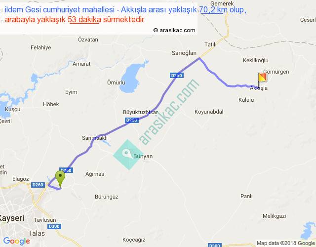 ildem Gesi cumhuriyet mahallesi - Akkışla arası yaklaşık olarak 90 km/h ile yukarıda belirtilen sürede olup, iki yerin kuş uçuşu uzaklığı (mesafesi) 53'dir. Yolculuk otobüsle 1 saat 8 dakika sürmektedir.