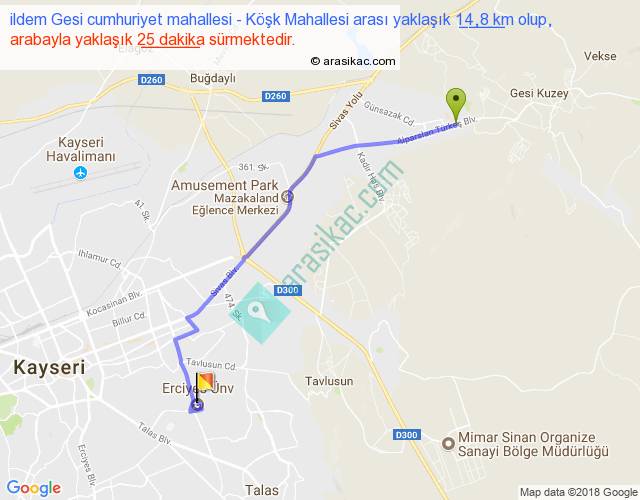 ildem Gesi cumhuriyet mahallesi - Köşk Mahallesi arası yaklaşık olarak 90 km/h ile yukarıda belirtilen sürede olup, iki yerin kuş uçuşu uzaklığı (mesafesi) 11'dir. Yolculuk otobüsle 32 dakika sürmektedir.
