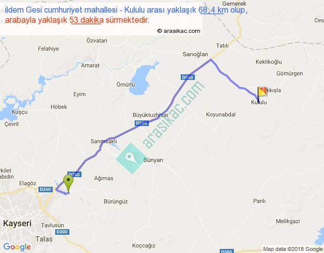 ildem Gesi cumhuriyet mahallesi - Kululu arası yaklaşık olarak 90 km/h ile yukarıda belirtilen sürede olup, iki yerin kuş uçuşu uzaklığı (mesafesi) 49'dir. Yolculuk otobüsle 1 saat 8 dakika sürmektedir.