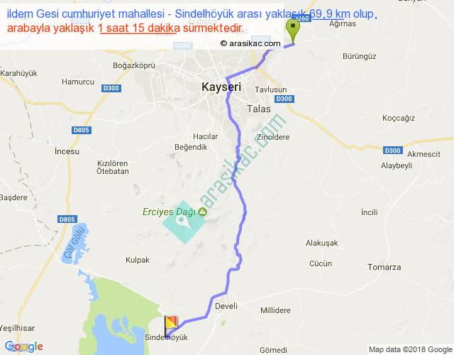ildem Gesi cumhuriyet mahallesi - Sindelhöyük arası yaklaşık olarak 90 km/h ile yukarıda belirtilen sürede olup, iki yerin kuş uçuşu uzaklığı (mesafesi) 53'dir. Yolculuk otobüsle 1 saat 37 dakika sürmektedir.