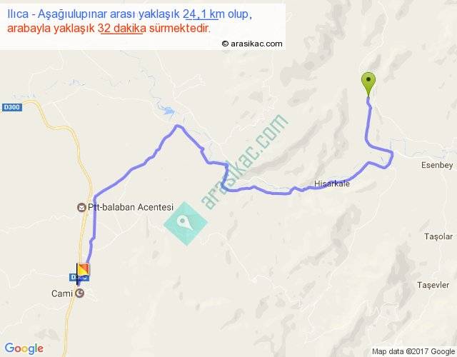 Ilıca - Aşağıulupınar arası yaklaşık olarak 90 km/h ile yukarıda belirtilen sürede olup, iki yerin kuş uçuşu uzaklığı (mesafesi) 14'dir. Yolculuk otobüsle 41 dakika sürmektedir.