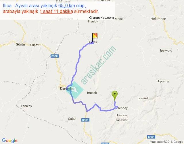 Ilıca - Ayvalı arası yaklaşık olarak 90 km/h ile yukarıda belirtilen sürede olup, iki yerin kuş uçuşu uzaklığı (mesafesi) 26'dir. Yolculuk otobüsle 1 saat 32 dakika sürmektedir.