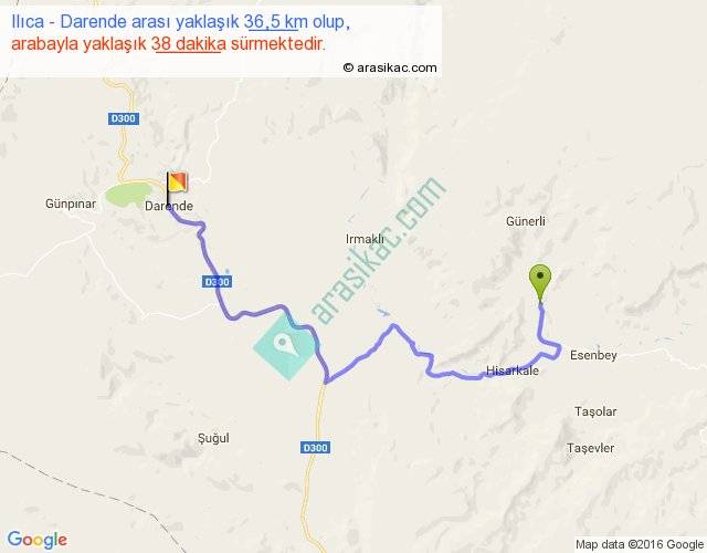Ilıca - Darende arası yaklaşık olarak 90 km/h ile yukarıda belirtilen sürede olup, iki yerin kuş uçuşu uzaklığı (mesafesi) 21'dir. Yolculuk otobüsle 49 dakika sürmektedir.