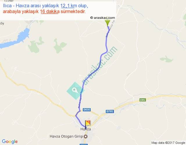 Ilıca - Havza arası yaklaşık olarak 90 km/h ile yukarıda belirtilen sürede olup, iki yerin kuş uçuşu uzaklığı (mesafesi) 10'dir. Yolculuk otobüsle 20 dakika sürmektedir.