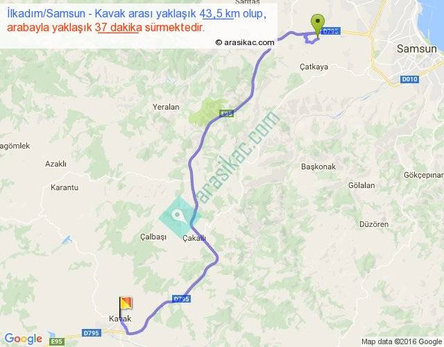 İlkadım Samsun - Kavak arası yaklaşık olarak 90 km/h ile yukarıda belirtilen sürede olup, iki yerin kuş uçuşu uzaklığı (mesafesi) 28'dir. Yolculuk otobüsle 48 dakika sürmektedir.