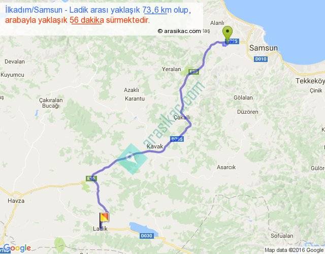 İlkadım Samsun - Ladik arası yaklaşık olarak 90 km/h ile yukarıda belirtilen sürede olup, iki yerin kuş uçuşu uzaklığı (mesafesi) 50'dir. Yolculuk otobüsle 1 saat 12 dakika sürmektedir.