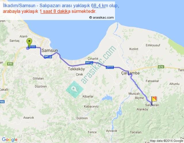 İlkadım Samsun - Salıpazarı arası yaklaşık olarak 90 km/h ile yukarıda belirtilen sürede olup, iki yerin kuş uçuşu uzaklığı (mesafesi) 54'dir. Yolculuk otobüsle 1 saat 28 dakika sürmektedir.