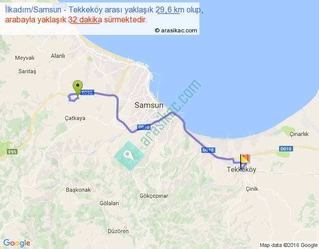 İlkadım Samsun - Tekkeköy arası yaklaşık olarak 90 km/h ile yukarıda belirtilen sürede olup, iki yerin kuş uçuşu uzaklığı (mesafesi) 20'dir. Yolculuk otobüsle 41 dakika sürmektedir.
