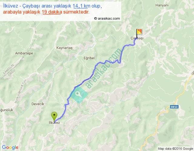 İlküvez - Çaybaşı arası yaklaşık olarak 90 km/h ile yukarıda belirtilen sürede olup, iki yerin kuş uçuşu uzaklığı (mesafesi) 11'dir. Yolculuk otobüsle 24 dakika sürmektedir.