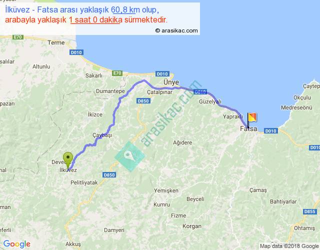 İlküvez - Fatsa arası yaklaşık olarak 90 km/h ile yukarıda belirtilen sürede olup, iki yerin kuş uçuşu uzaklığı (mesafesi) 42'dir. Yolculuk otobüsle 1 saat 18 dakika sürmektedir.