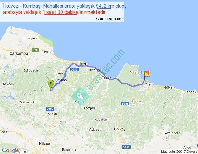 İlküvez - Kumbaşı Mahallesi arası yaklaşık olarak 90 km/h ile yukarıda belirtilen sürede olup, iki yerin kuş uçuşu uzaklığı (mesafesi) 70'dir. Yolculuk otobüsle 1 saat 57 dakika sürmektedir.