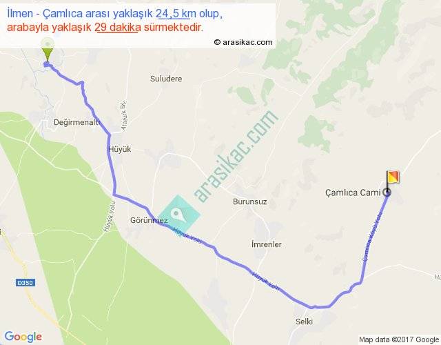 İlmen - Çamlıca arası yaklaşık olarak 90 km/h ile yukarıda belirtilen sürede olup, iki yerin kuş uçuşu uzaklığı (mesafesi) 16'dir. Yolculuk otobüsle 37 dakika sürmektedir.