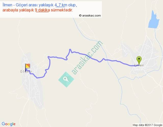 İlmen - Göçeri arası yaklaşık olarak 90 km/h ile yukarıda belirtilen sürede olup, iki yerin kuş uçuşu uzaklığı (mesafesi) 3'dir. Yolculuk otobüsle 11 dakika sürmektedir.