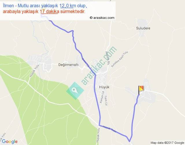 İlmen - Mutlu arası yaklaşık olarak 90 km/h ile yukarıda belirtilen sürede olup, iki yerin kuş uçuşu uzaklığı (mesafesi) 6'dir. Yolculuk otobüsle 22 dakika sürmektedir.