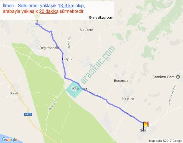 İlmen - Selki arası yaklaşık olarak 90 km/h ile yukarıda belirtilen sürede olup, iki yerin kuş uçuşu uzaklığı (mesafesi) 16'dir. Yolculuk otobüsle 26 dakika sürmektedir.