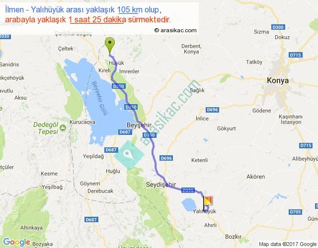İlmen - Yalıhüyük arası yaklaşık olarak 90 km/h ile yukarıda belirtilen sürede olup, iki yerin kuş uçuşu uzaklığı (mesafesi) 88'dir. Yolculuk otobüsle 1 saat 50 dakika sürmektedir.