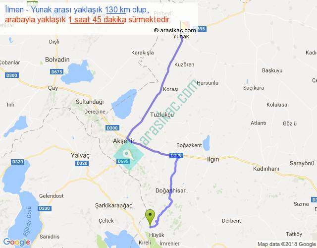 İlmen - Yunak arası yaklaşık olarak 90 km/h ile yukarıda belirtilen sürede olup, iki yerin kuş uçuşu uzaklığı (mesafesi) 93'dir. Yolculuk otobüsle 2 saat 16 dakika sürmektedir.