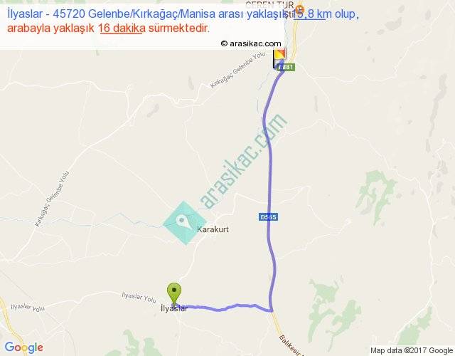 İlyaslar - 45720 Gelenbe Kırkağaç Manisa arası yaklaşık olarak 90 km/h ile yukarıda belirtilen sürede olup, iki yerin kuş uçuşu uzaklığı (mesafesi) 11'dir. Yolculuk otobüsle 20 dakika sürmektedir.