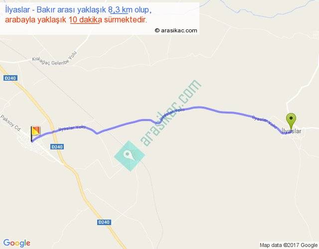 İlyaslar - Bakır arası yaklaşık olarak 90 km/h ile yukarıda belirtilen sürede olup, iki yerin kuş uçuşu uzaklığı (mesafesi) 8'dir. Yolculuk otobüsle 13 dakika sürmektedir.