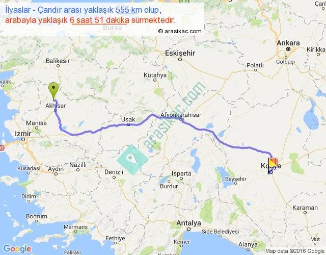 İlyaslar - Çandır arası yaklaşık olarak 90 km/h ile yukarıda belirtilen sürede olup, iki yerin kuş uçuşu uzaklığı (mesafesi) 424'dir. Eğer belirtilen yerler arasında uçak seferi var ise bu süre uçakla 39 dakika'ya kadar düşebilir. Yolculuk otobüsle 8 saat 54 dakika sürmektedir.