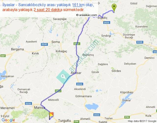 İlyaslar - Sancaklıbozköy arası yaklaşık olarak 90 km/h ile yukarıda belirtilen sürede olup, iki yerin kuş uçuşu uzaklığı (mesafesi) 120'dir. Yolculuk otobüsle 3 saat 2 dakika sürmektedir.