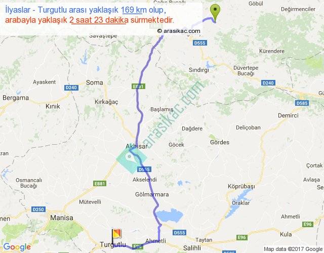 İlyaslar - Turgutlu arası yaklaşık olarak 90 km/h ile yukarıda belirtilen sürede olup, iki yerin kuş uçuşu uzaklığı (mesafesi) 114'dir. Yolculuk otobüsle 3 saat 5 dakika sürmektedir.