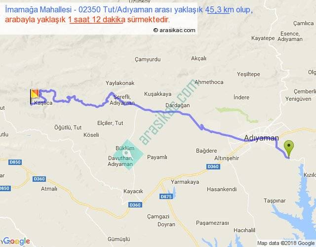 İmamağa Mahallesi - 02350 Tut Adıyaman arası yaklaşık olarak 90 km/h ile yukarıda belirtilen sürede olup, iki yerin kuş uçuşu uzaklığı (mesafesi) 32'dir. Yolculuk otobüsle 1 saat 33 dakika sürmektedir.
