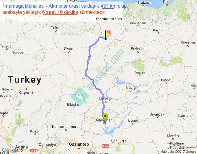 İmamağa Mahallesi - Akıncılar arası yaklaşık olarak 90 km/h ile yukarıda belirtilen sürede olup, iki yerin kuş uçuşu uzaklığı (mesafesi) 258'dir. Eğer belirtilen yerler arasında uçak seferi var ise bu süre uçakla 23 dakika'ya kadar düşebilir. Yolculuk otobüsle 8 saat 8 dakika sürmektedir.