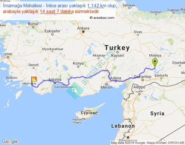 İmamağa Mahallesi - İnlice arası yaklaşık olarak 90 km/h ile yukarıda belirtilen sürede olup, iki yerin kuş uçuşu uzaklığı (mesafesi) 827'dir. Eğer belirtilen yerler arasında uçak seferi var ise bu süre uçakla 1 saat 16 dakika'ya kadar düşebilir. Yolculuk otobüsle 18 saat 21 dakika sürmektedir.
