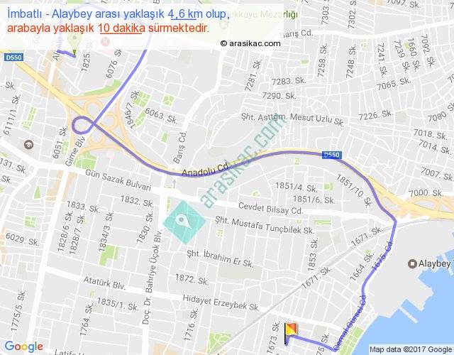İmbatlı - Alaybey arası yaklaşık olarak 90 km/h ile yukarıda belirtilen sürede olup, iki yerin kuş uçuşu uzaklığı (mesafesi) 2'dir. Yolculuk otobüsle 13 dakika sürmektedir.