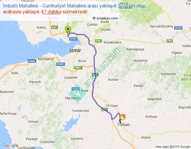 İmbatlı Mahallesi - Cumhuriyet Mahallesi arası yaklaşık olarak 90 km/h ile yukarıda belirtilen sürede olup, iki yerin kuş uçuşu uzaklığı (mesafesi) 40'dir. Yolculuk otobüsle 1 saat 1 dakika sürmektedir.