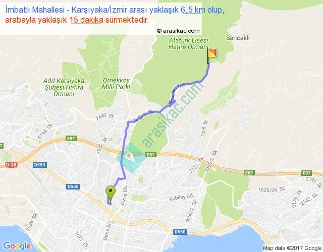 İmbatlı Mahallesi - Karşıyaka İzmir arası yaklaşık olarak 90 km/h ile yukarıda belirtilen sürede olup, iki yerin kuş uçuşu uzaklığı (mesafesi) 5'dir. Yolculuk otobüsle 19 dakika sürmektedir.