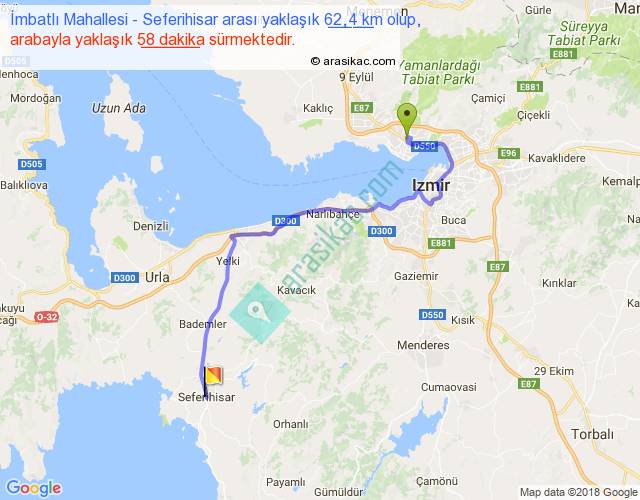 İmbatlı Mahallesi - Seferihisar arası yaklaşık olarak 90 km/h ile yukarıda belirtilen sürede olup, iki yerin kuş uçuşu uzaklığı (mesafesi) 39'dir. Yolculuk otobüsle 1 saat 15 dakika sürmektedir.