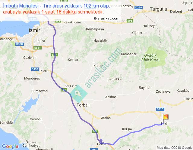İmbatlı Mahallesi - Tire arası yaklaşık olarak 90 km/h ile yukarıda belirtilen sürede olup, iki yerin kuş uçuşu uzaklığı (mesafesi) 69'dir. Yolculuk otobüsle 1 saat 41 dakika sürmektedir.