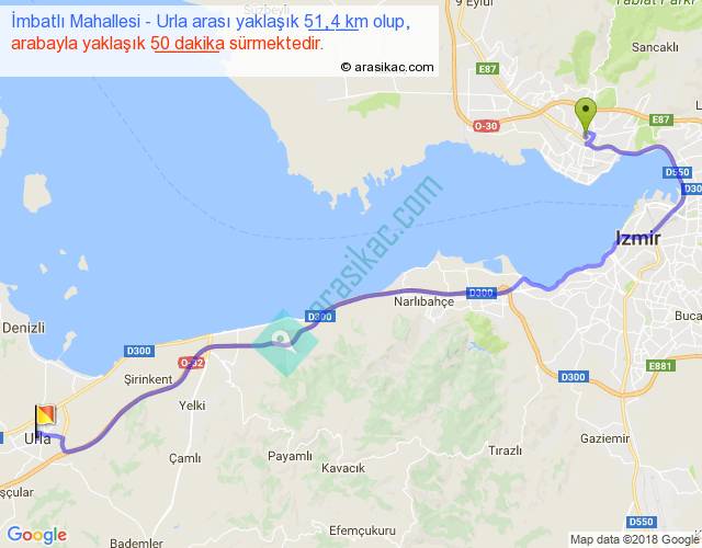 İmbatlı Mahallesi - Urla arası yaklaşık olarak 90 km/h ile yukarıda belirtilen sürede olup, iki yerin kuş uçuşu uzaklığı (mesafesi) 34'dir. Yolculuk otobüsle 1 saat 5 dakika sürmektedir.