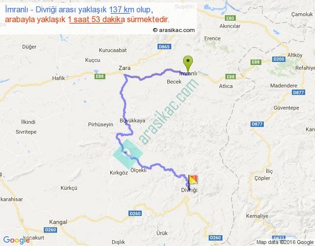 İmranlı - Divriği arası yaklaşık olarak 90 km/h ile yukarıda belirtilen sürede olup, iki yerin kuş uçuşu uzaklığı (mesafesi) 55'dir. Yolculuk otobüsle 2 saat 26 dakika sürmektedir.