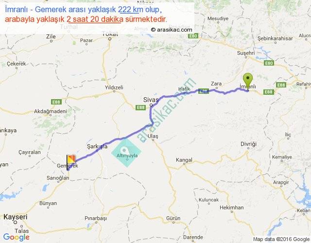 İmranlı - Gemerek arası yaklaşık olarak 90 km/h ile yukarıda belirtilen sürede olup, iki yerin kuş uçuşu uzaklığı (mesafesi) 190'dir. Yolculuk otobüsle 3 saat 2 dakika sürmektedir.