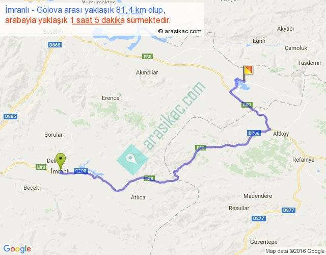 İmranlı - Gölova arası yaklaşık olarak 90 km/h ile yukarıda belirtilen sürede olup, iki yerin kuş uçuşu uzaklığı (mesafesi) 47'dir. Yolculuk otobüsle 1 saat 24 dakika sürmektedir.