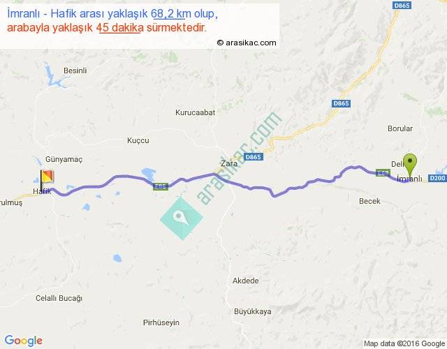 İmranlı - Hafik arası yaklaşık olarak 90 km/h ile yukarıda belirtilen sürede olup, iki yerin kuş uçuşu uzaklığı (mesafesi) 61'dir. Yolculuk otobüsle 58 dakika sürmektedir.
