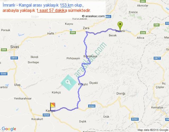 İmranlı - Kangal arası yaklaşık olarak 90 km/h ile yukarıda belirtilen sürede olup, iki yerin kuş uçuşu uzaklığı (mesafesi) 94'dir. Yolculuk otobüsle 2 saat 32 dakika sürmektedir.