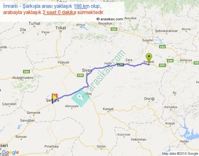 İmranlı - Şarkışla arası yaklaşık olarak 90 km/h ile yukarıda belirtilen sürede olup, iki yerin kuş uçuşu uzaklığı (mesafesi) 156'dir. Yolculuk otobüsle 2 saat 36 dakika sürmektedir.